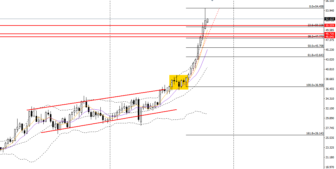 白银上周冲高回落,RSI位于超买区,波段有望维持涨势。周五深度下挫,下探10日均线,日线RSI自高位回落,4小时空头动能占优,53下方可延续高空思路,后市预计将重新回踩50.50。