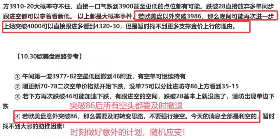 昨日周四凌晨美联储如期加息,但是在鲍威尔随后讲话中明确表达出美联储对于12月降息与否存在明显分歧,这一次并没有用以往惯用的太极手段,结合美国政府部门停摆,一定程度上的影响了美联储对于短期数据的判断,整体利空黄金。并且午后时段中美贸易谈判传出利好消息,同时中美元首会晤同步传出和谐信号,所有的一切都不利于黄金的多头,可市场往往总是充满着“惊喜”或者“惊吓”。 在昨日欧盘之前我们主要思路还是以跟进市场反弹做空为主,早间的70-80区间空两次一次回落到52,第二次回落到56。 但当金价第三次反弹走高,突破白盘高点82-84后直接出现惯性上涨,和周三的走势如出一辙, 同样的点位,同样的反弹,同样的节奏,一口气突破86后直接冲击到4000上方。我们在昨日金评中还反复提醒过大家,一旦破位86说明风向转变,一定要及时改变思路!