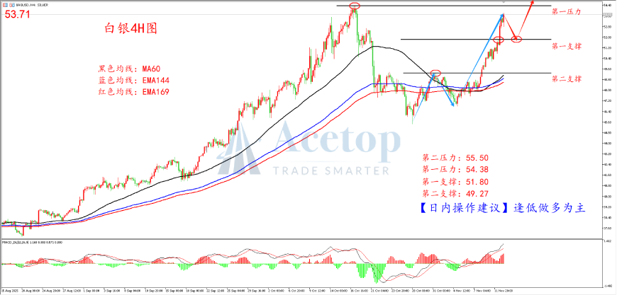 从上图黄金1小时图来看,黄金目前多头表现强势,高点和低点呈现出逐渐抬高的多头趋势特征,这表明黄金仍以偏多为主。从均线上来看,黄金目前已经明显站上了关键均线EMA144和EMA169,且MA60均线也一直在为金价提供支撑,这也表明金价目前处于偏多的格局中。上图中画出了黄金目前面临的重要支撑位,压力位以及预期的后市走势图,预计日内金价将在短暂回调后继续上涨,故操作上建议以逢低做多为主。