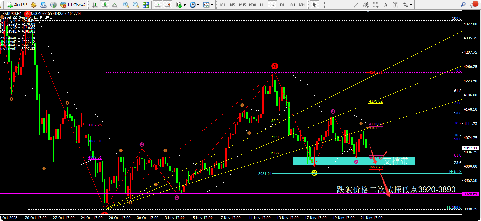 就日线的斐波拉契回调线看:主要关注4022和3997一线,跌破就是日线的二次下跌。