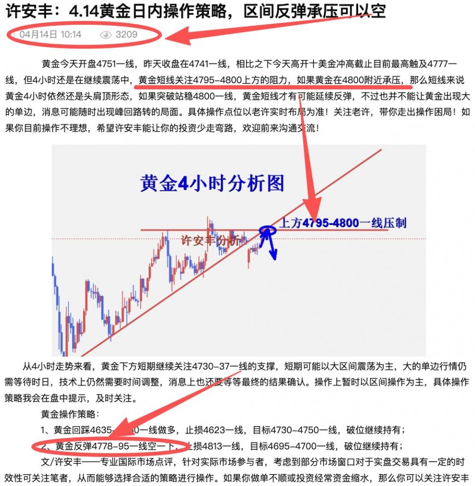 许安丰:4.14黄金晚间操作策略,日内二连空完美获利