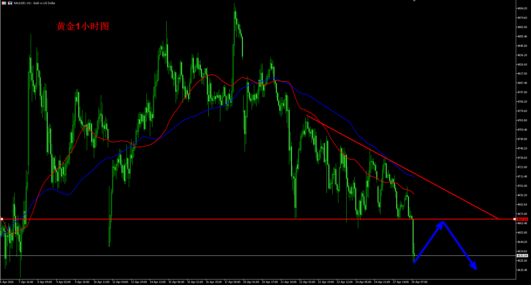 王杨:黄金下跌三角形终破位,午后反弹继续空!