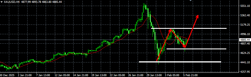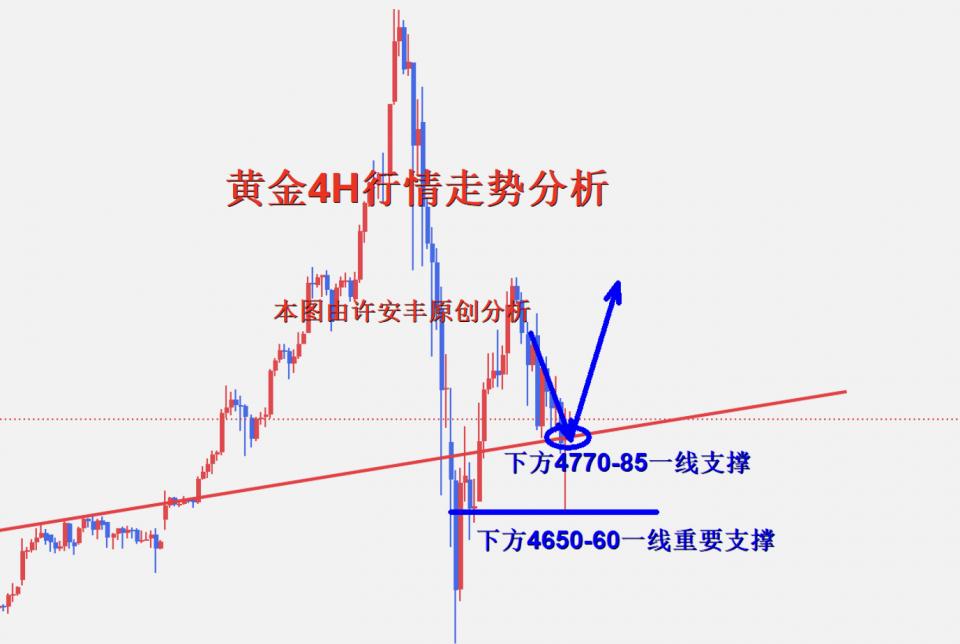 黄金反弹企稳4800美元关口,短期形成下降三角形形态